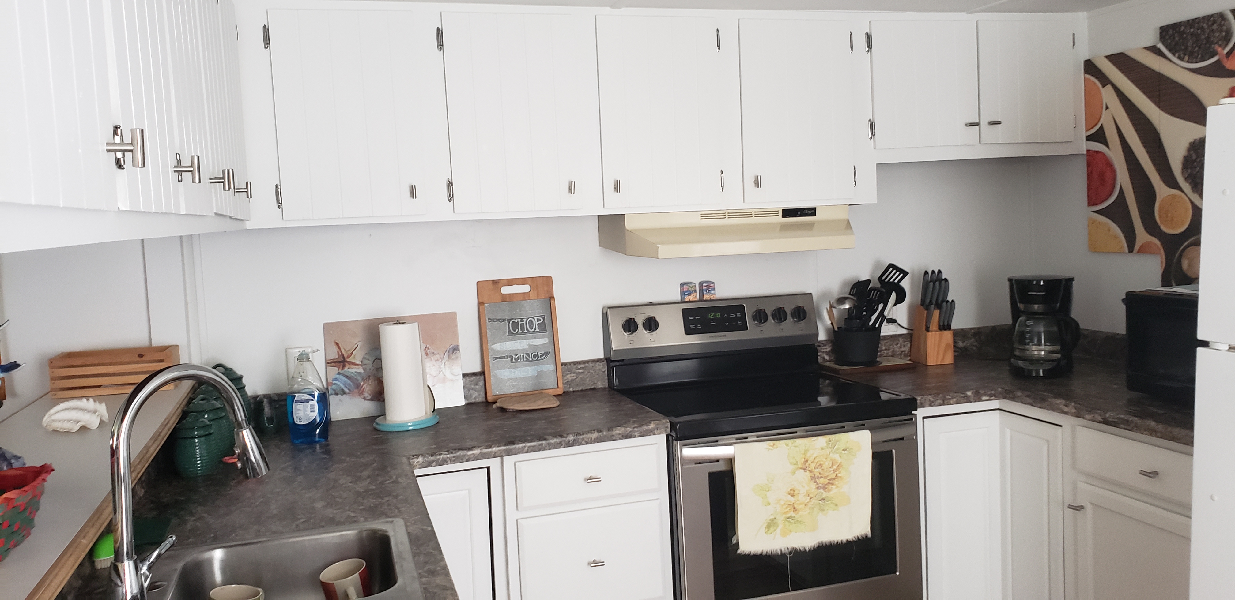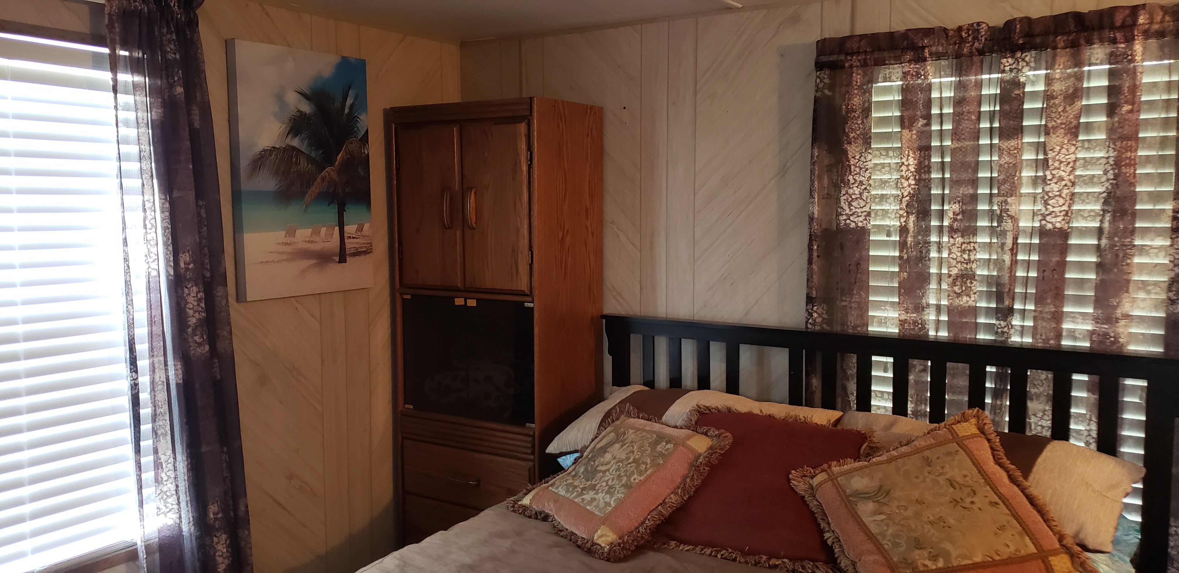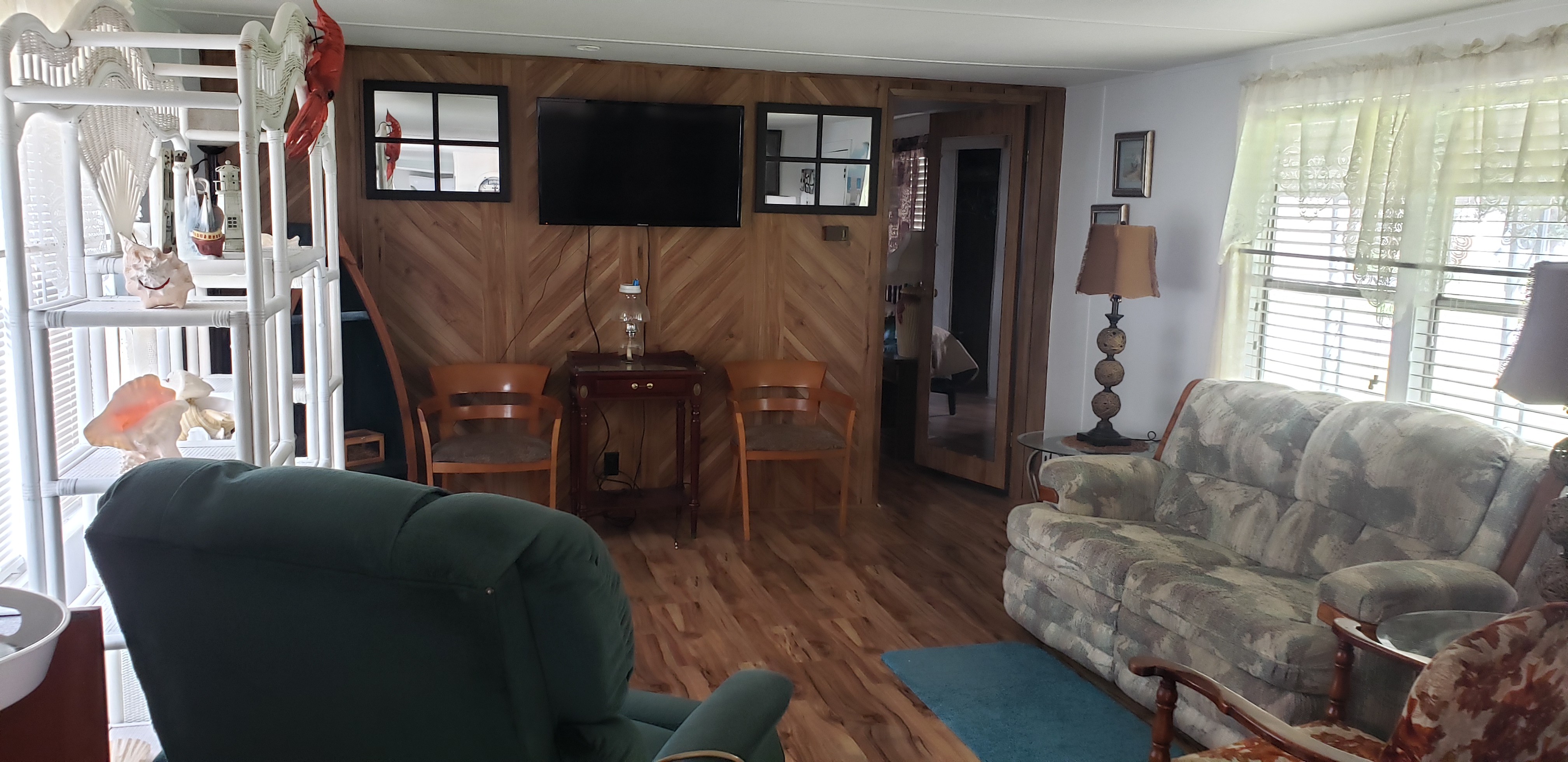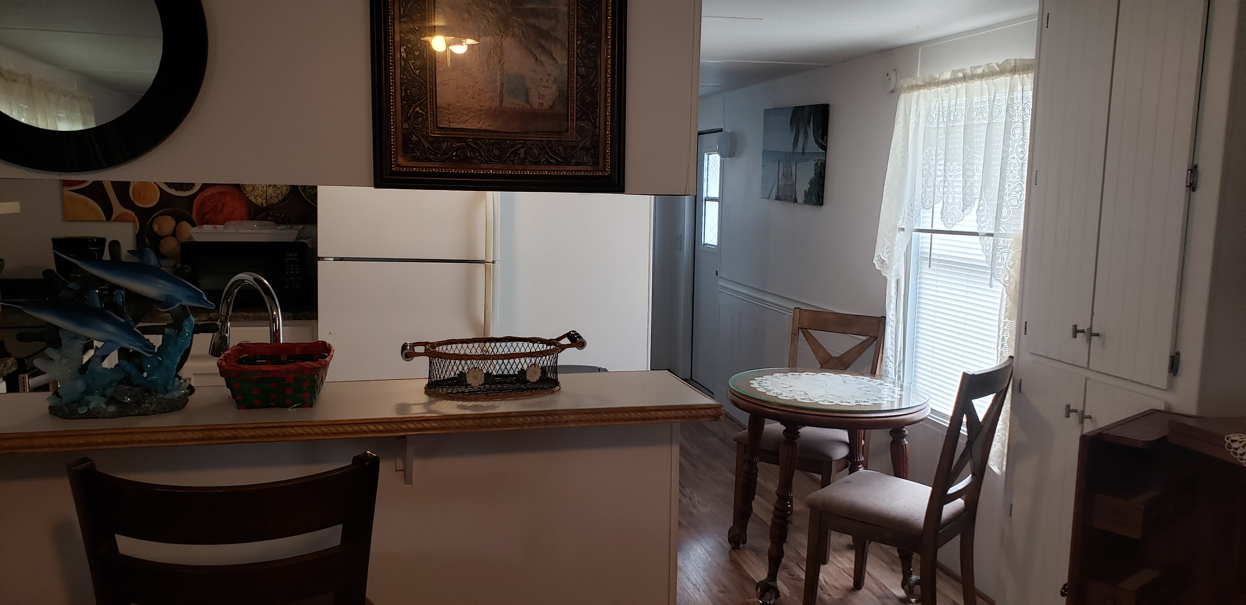 Coastal theme for 55+ living. Relax in living room with large tv and double recliner couch and additional electric lift recliner. Bar between living and kitchen seats 2. All electric kitchen has lots of cabinet space and small kitchen table. Laundry room has washer & dryer. Split bedrooms with queen bed, one in front, the other in back. Even has storage building and 2 car carport with room for BBQ and porch sitting. Additional guest charge of $50. per night.