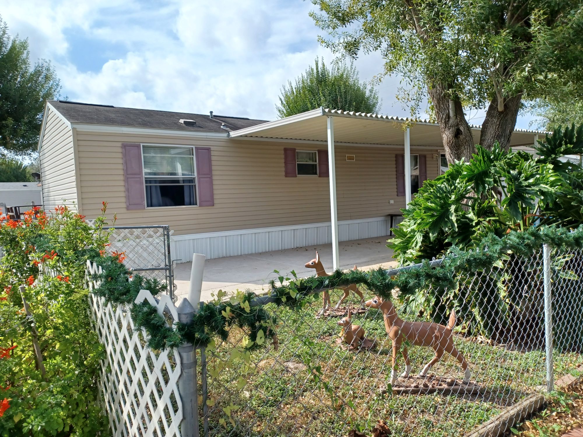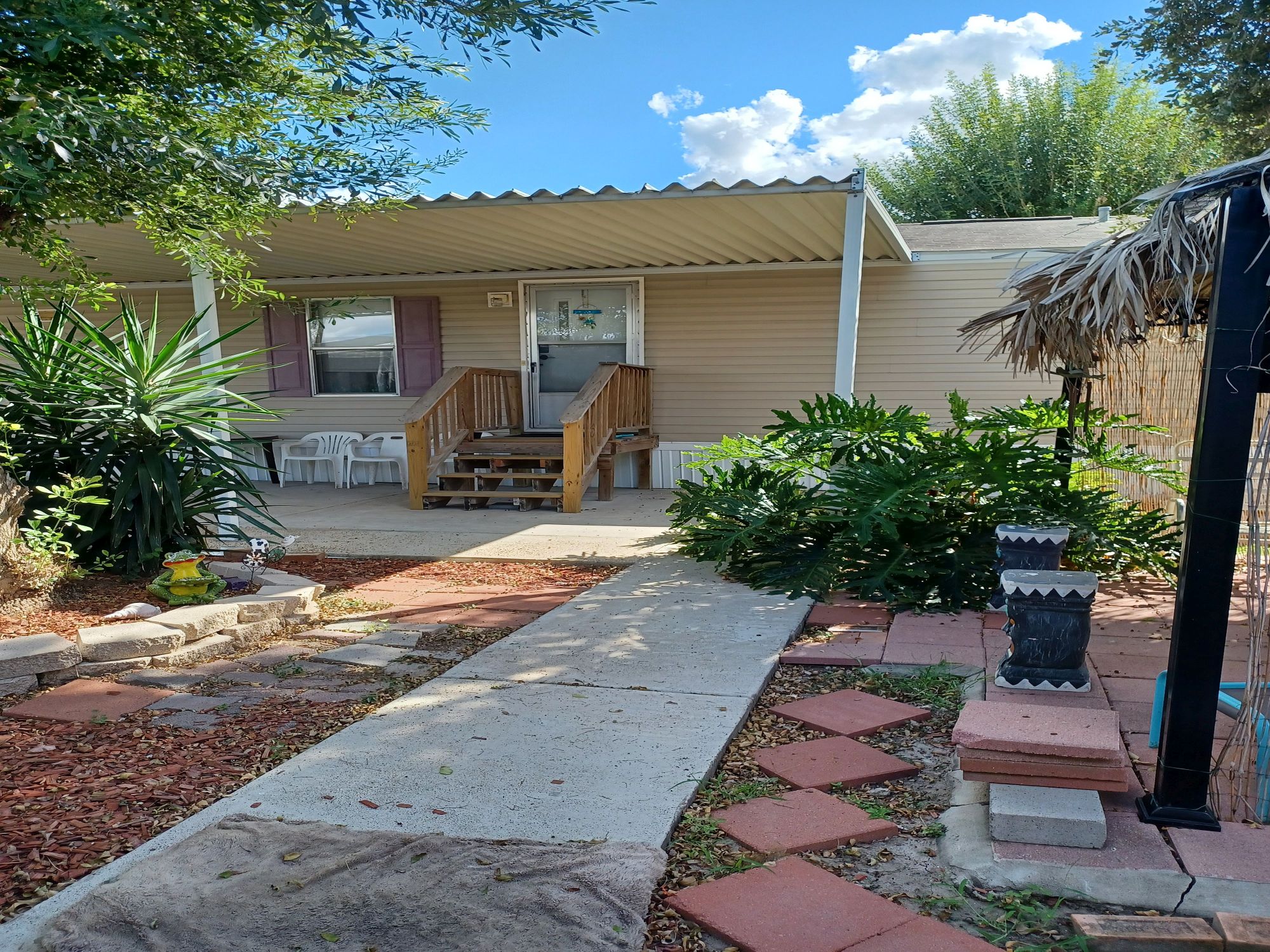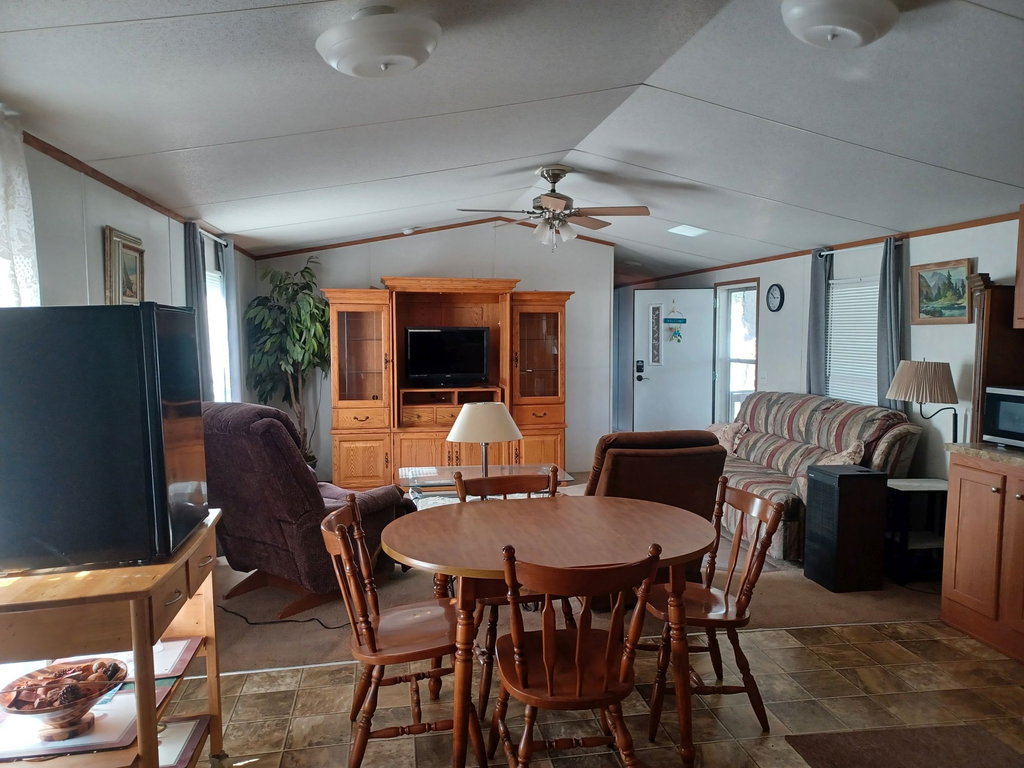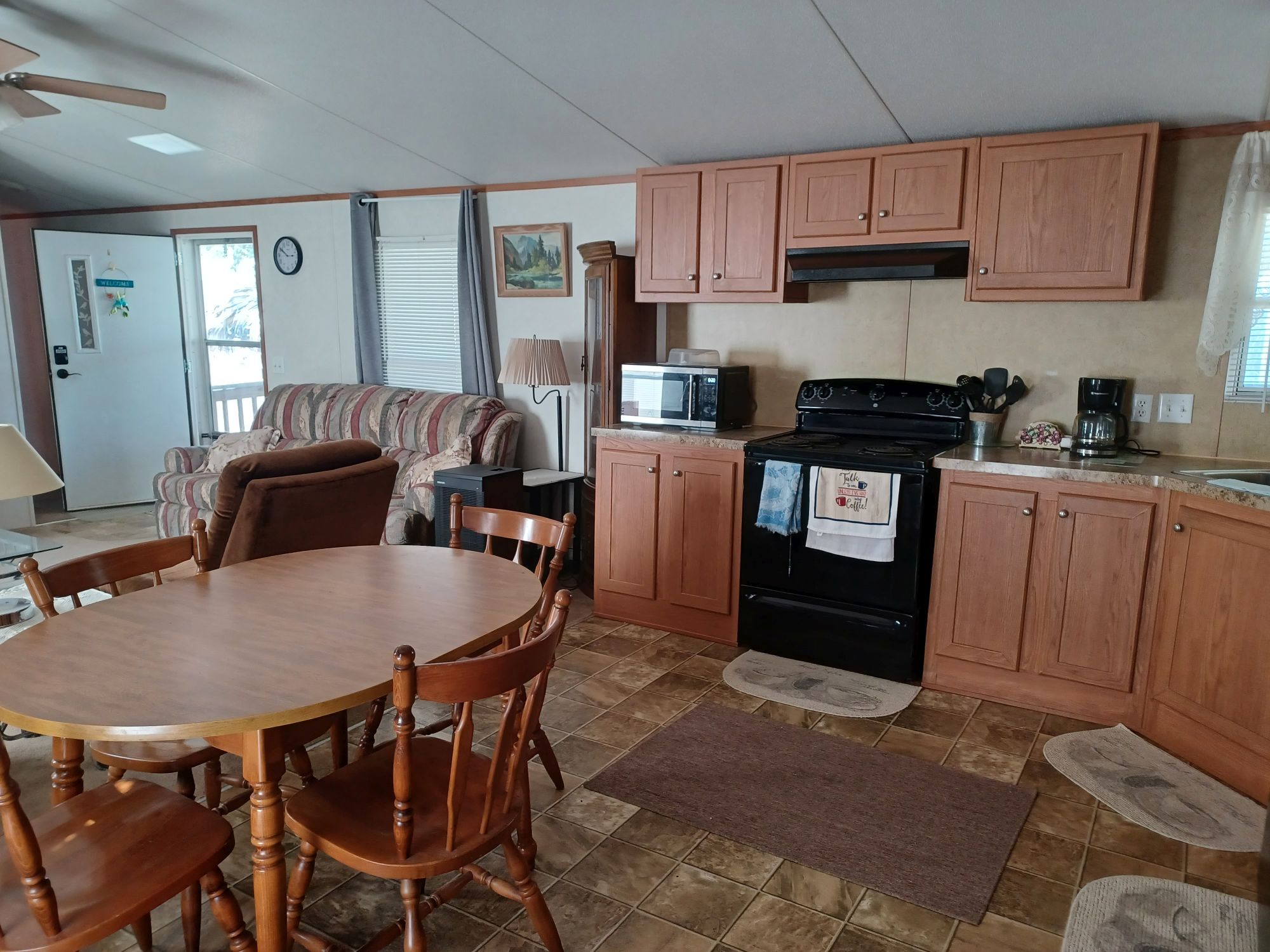 This is a 55+ property with open living/dining room area. Living room has double recliner couch, rocker, and another recliner chair. TV with entertainment center, along with a library of movies and books. Even a vinyl record player & records. All electric kitchen with microwave, and table seating for 4. Washer & dryer included. Master bedroom/bath with king bed in front and 2 bedrooms/bath in back with queen and full beds. Storage building included plus 2 car carport with room for BBQ and porch sitting. A small patio in back PLUS side patio and tiki-hut for relaxing. Additional charge of $50. per night for guests.