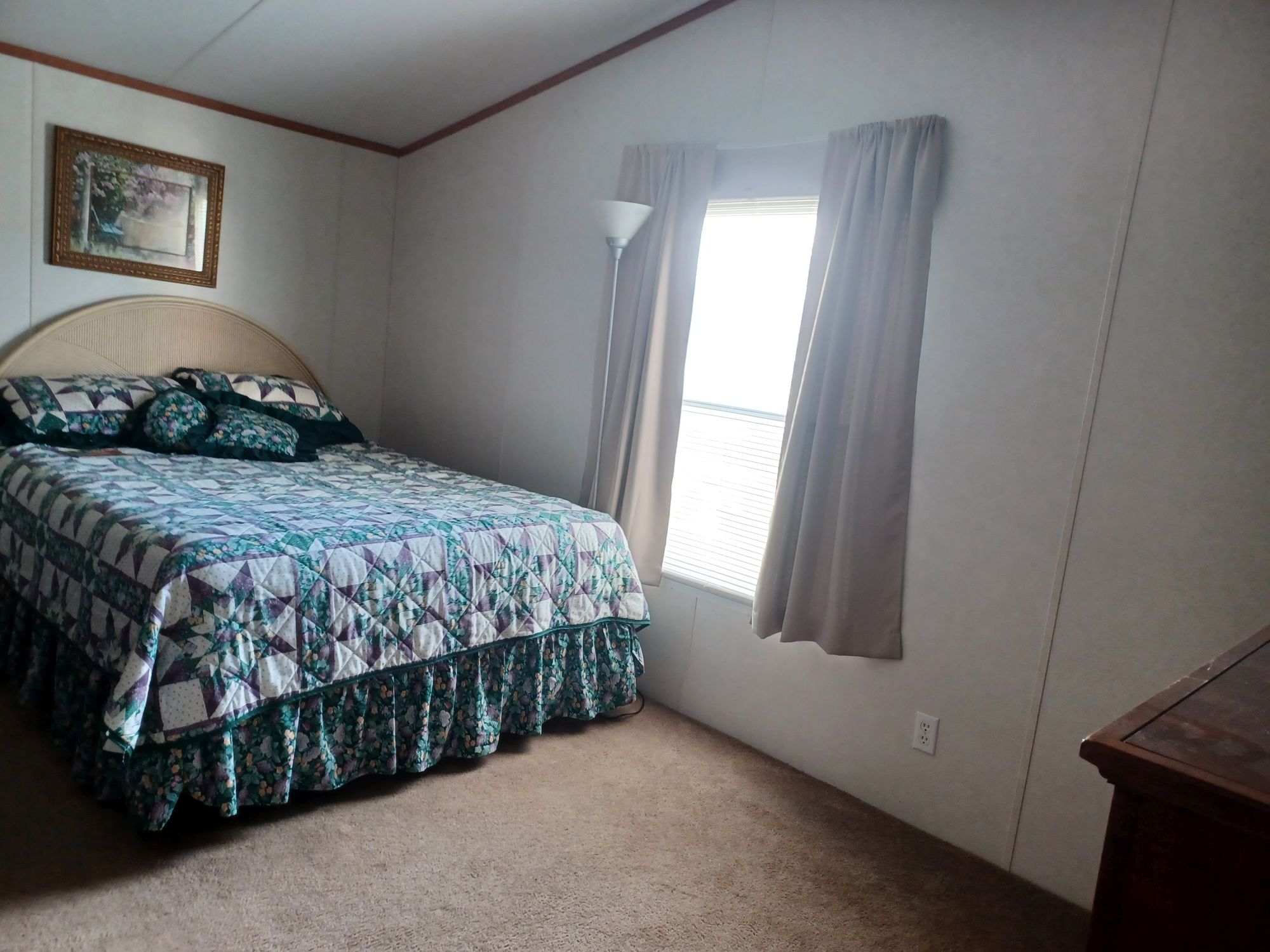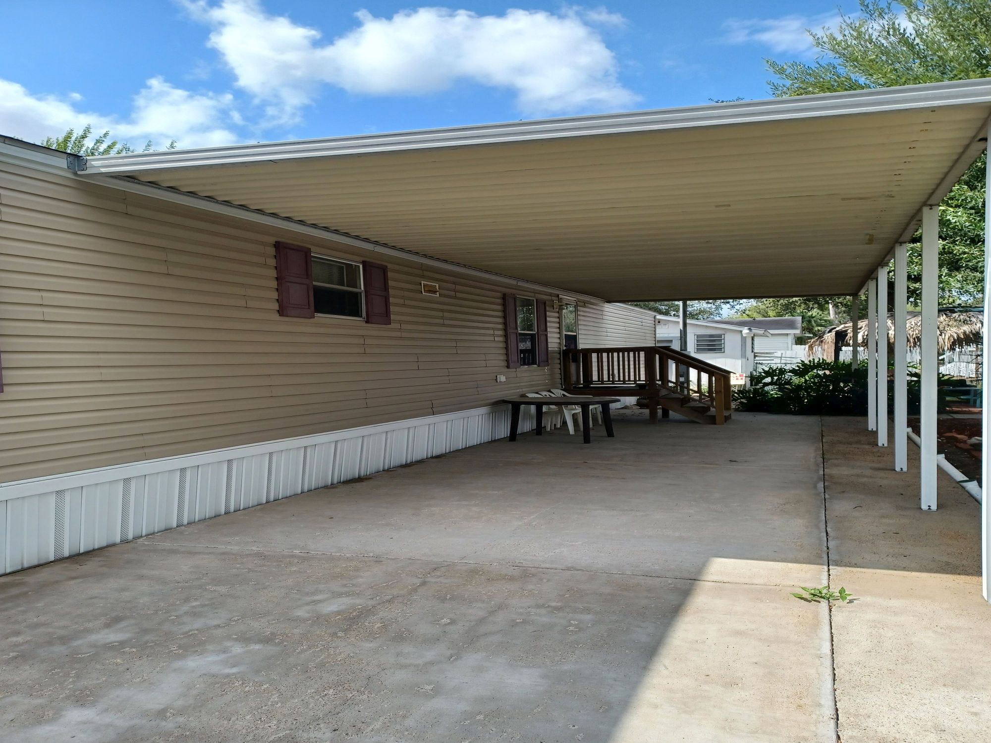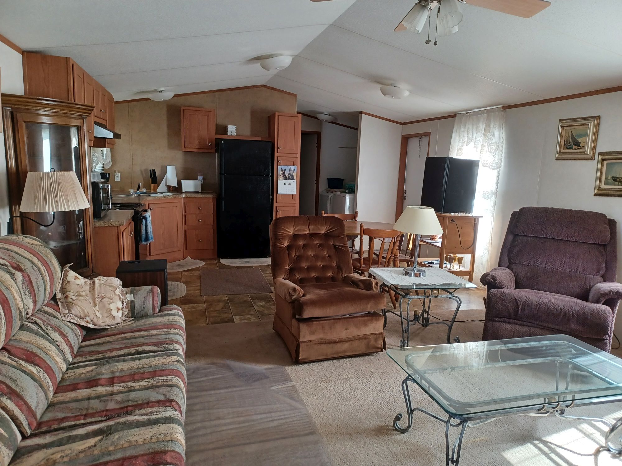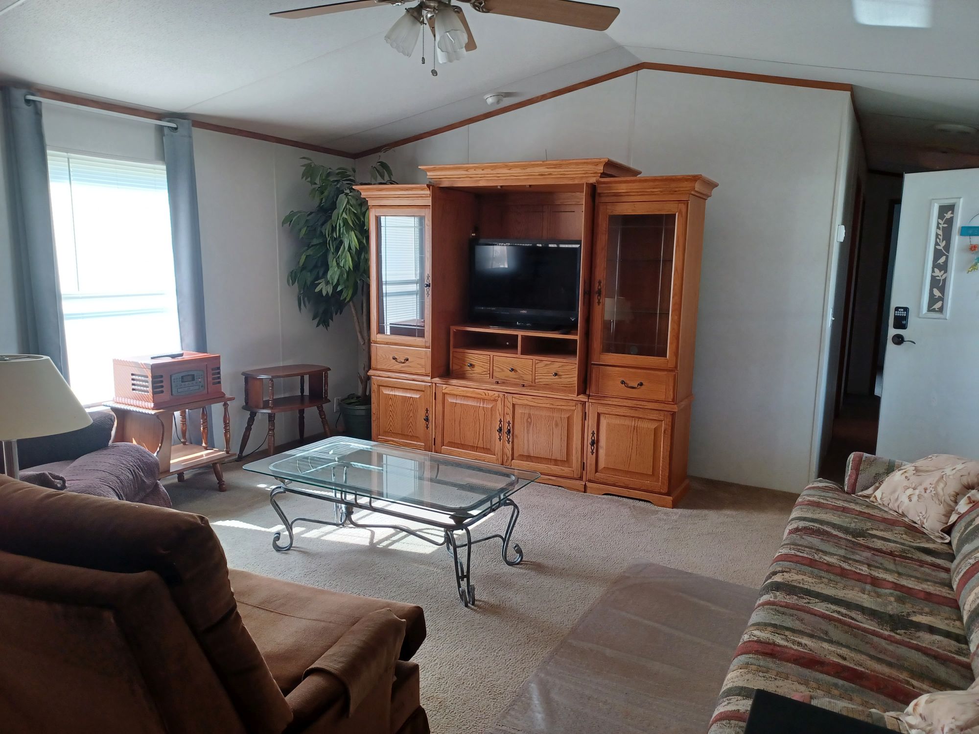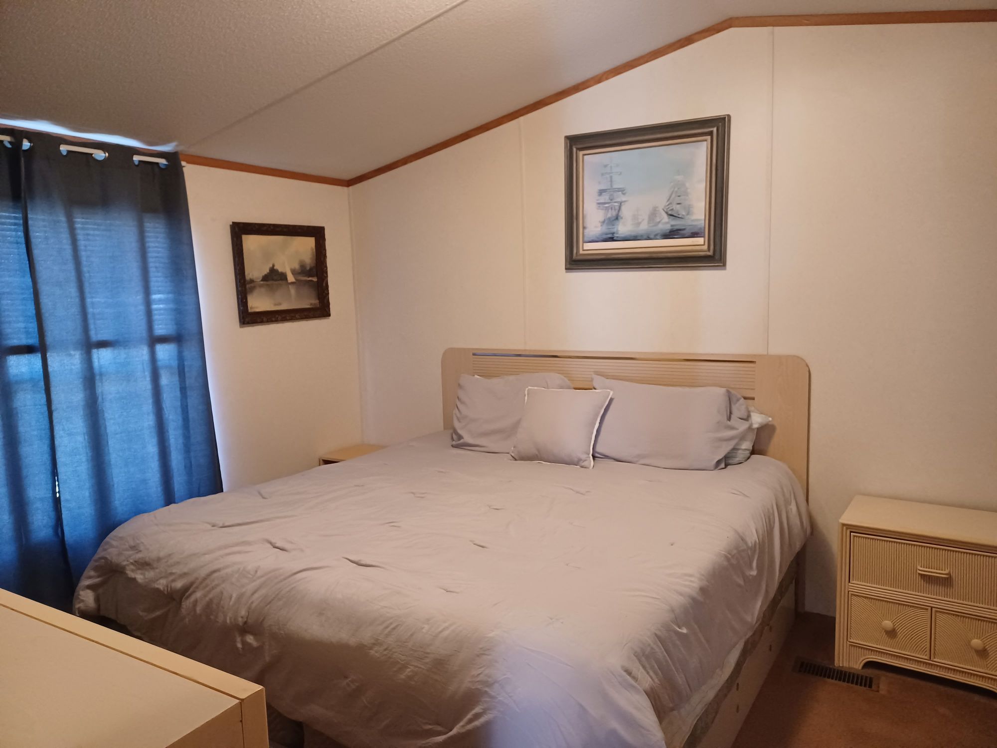This is a 55+ property with open living/dining room area. Living room has double recliner couch, rocker, and another recliner chair. TV with entertainment center, along with a library of movies and books. Even a vinyl record player & records. All electric kitchen with microwave, and table seating for 4. Washer & dryer included. Master bedroom/bath with king bed in front and 2 bedrooms/bath in back with queen and full beds. Storage building included plus 2 car carport with room for BBQ and porch sitting. A small patio in back PLUS side patio and tiki-hut for relaxing. Additional charge of $50. per night for guests.