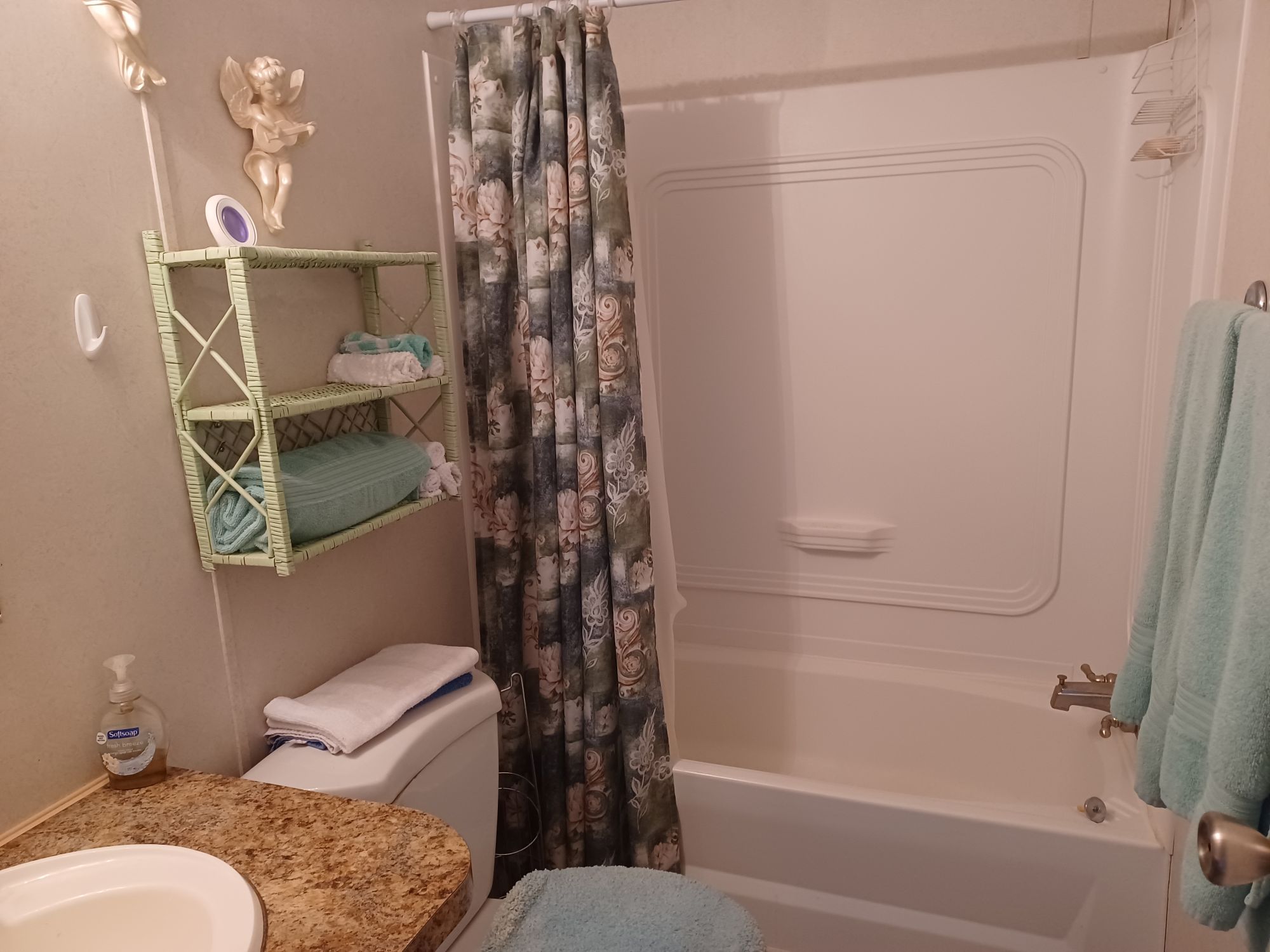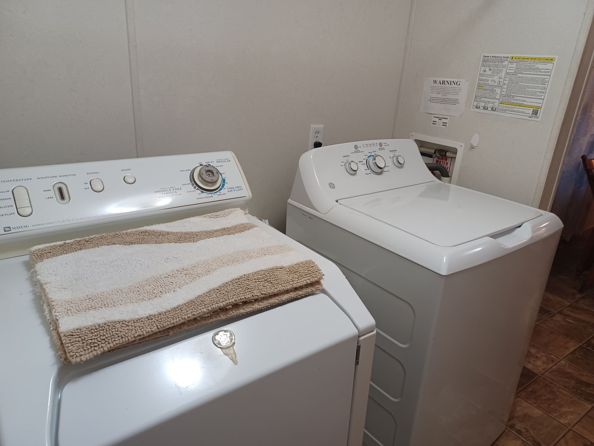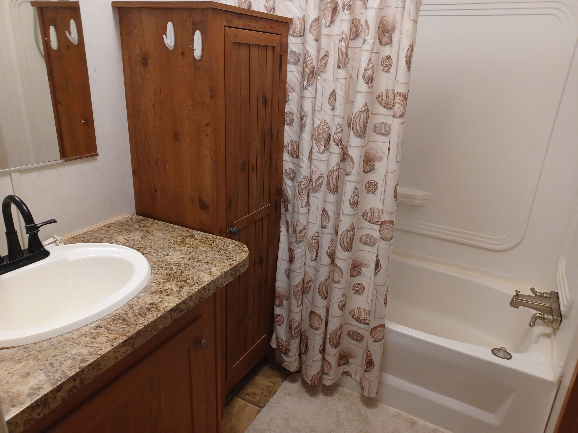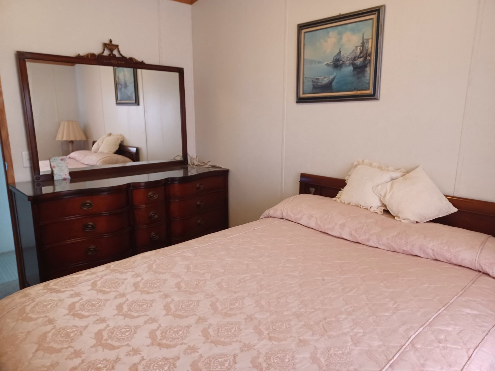 This is a 55+ property with open living/dining room area. Living room has double recliner couch, rocker, and another recliner chair. TV with entertainment center, along with a library of movies and books. Even a vinyl record player & records. All electric kitchen with microwave, and table seating for 4. Washer & dryer included. Master bedroom/bath with king bed in front and 2 bedrooms/bath in back with queen and full beds. Storage building included plus 2 car carport with room for BBQ and porch sitting. A small patio in back PLUS side patio and tiki-hut for relaxing. Additional charge of $50. per night for guests.
